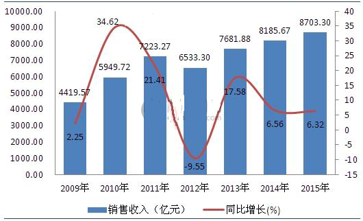 2009-2015年我儀器儀表制造行業(yè)銷售收入變化情況(單位:億元,%)